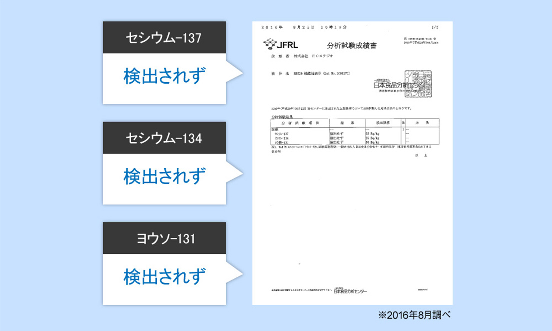 皆さまに安心してご利用頂けるよう、製造した最終錠剤を一般財団法人日本食品分析センターにて放射能検査を実施しております。