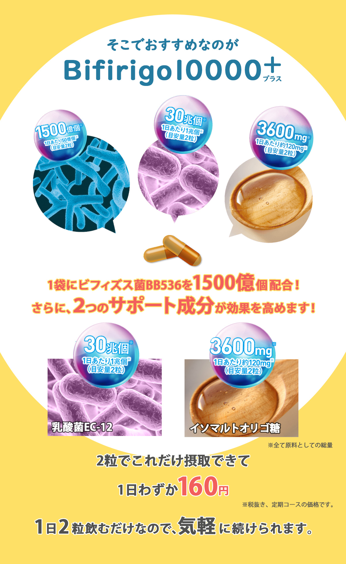 Bifirigo10000は、機能性関与成分の「ビフィズス菌BB536」さらにサポート成分として、